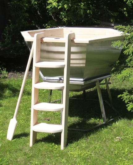 Банный чан из нержавеющей стали Ø-2350 на подставке с приставной печью Банный чан с приставной печкой изготовлен из пищевой стали. Представляет собой большую ёмкость в виде чаши, при нагревании которой можно париться на свежем воздухе. Чан установлен на устойчивую металлическую подставку и оснащен приставной печью с дымоходом. Банный чан оборудован кедровым бортом, скамейками, подспинниками, трапом для ног и приставной лестницей.
