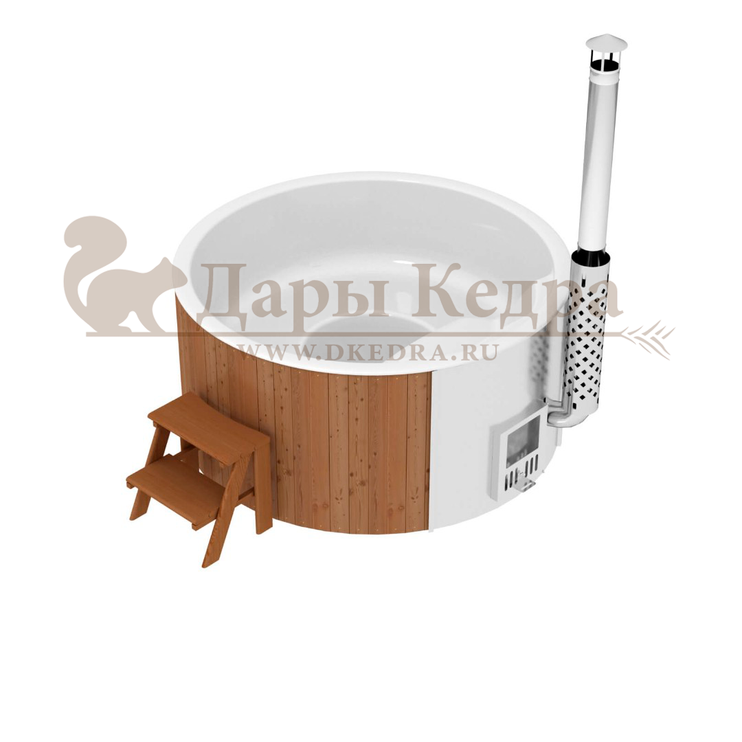 Финская круглая композитная купель с подогревом (с печкой) «Премиум 220 хот с печью 45 квт» Это уличная подогреваемая купель с круглой внутренней чашей, которая изготовлена из современного прочного и термоустойчивого материала (композита). Форма чаши обеспечивает комфортную посадку во время принятия процедур. Для удобства пользования купель оборудована приставной лестницей. Подогрев воды осуществляется внешней печью с дымоходом. Композитная вставка придает купели красивый внешний вид, продлевает срок службы и облегчает уход за изделием. Парение на свежем воздухе – это отличный способ укрепить здоровье и поддержать организм в тонусе.