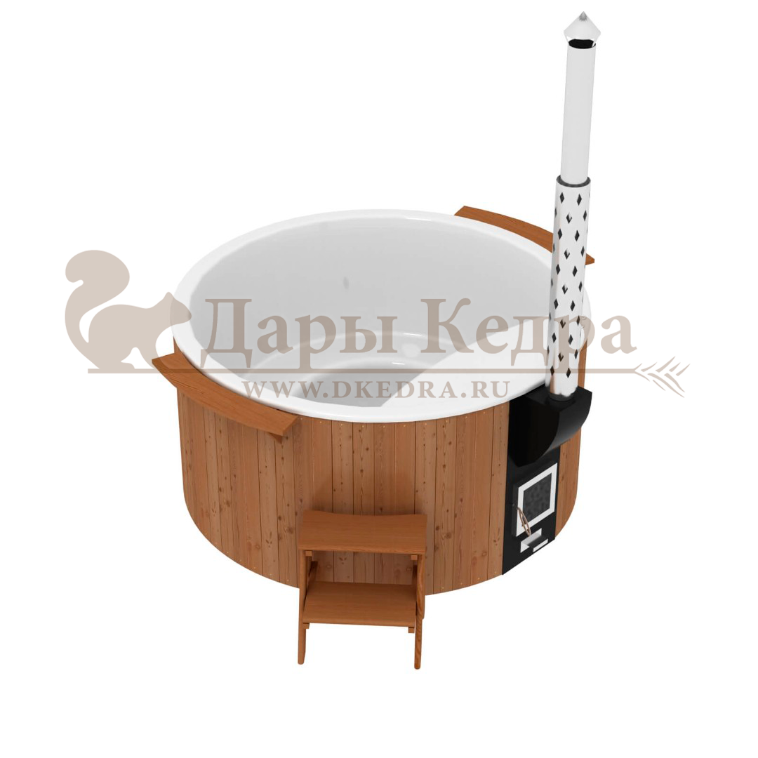 Финская круглая композитная купель с подогревом (с печкой) «Премиум 220 35 квт» Это уличная подогреваемая купель с круглой внутренней чашей, которая изготовлена из современного прочного и термоустойчивого материала (композита). Форма чаши обеспечивает комфортную посадку во время принятия процедур. Для удобства пользования купель фурако оборудована приставной лестницей. Нагрев воды осуществляется за счет встроенной печи, которая находится внутри купели за перегородкой из кедра. В комплектацию этой модели входит савок с длинной ручкой, который позволяет извлекать угли после эксплуатации изделия. Композитная вставка придает купели красивый внешний вид, продлевает срок службы и облегчает уход за изделием. Парение на свежем воздухе – это отличный способ укрепить здоровье и поддержать организм в тонусе.