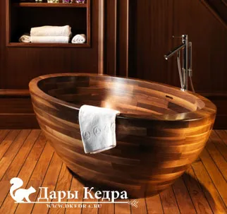 - Кедр, природный антисептик, создаёт целебный микроклимат, насыщает фитонцидами воду и воздух в ванной комнате. Во время водных процедур вы будете наслаждаться приятным хвойным ароматом, исходящим от дерева.